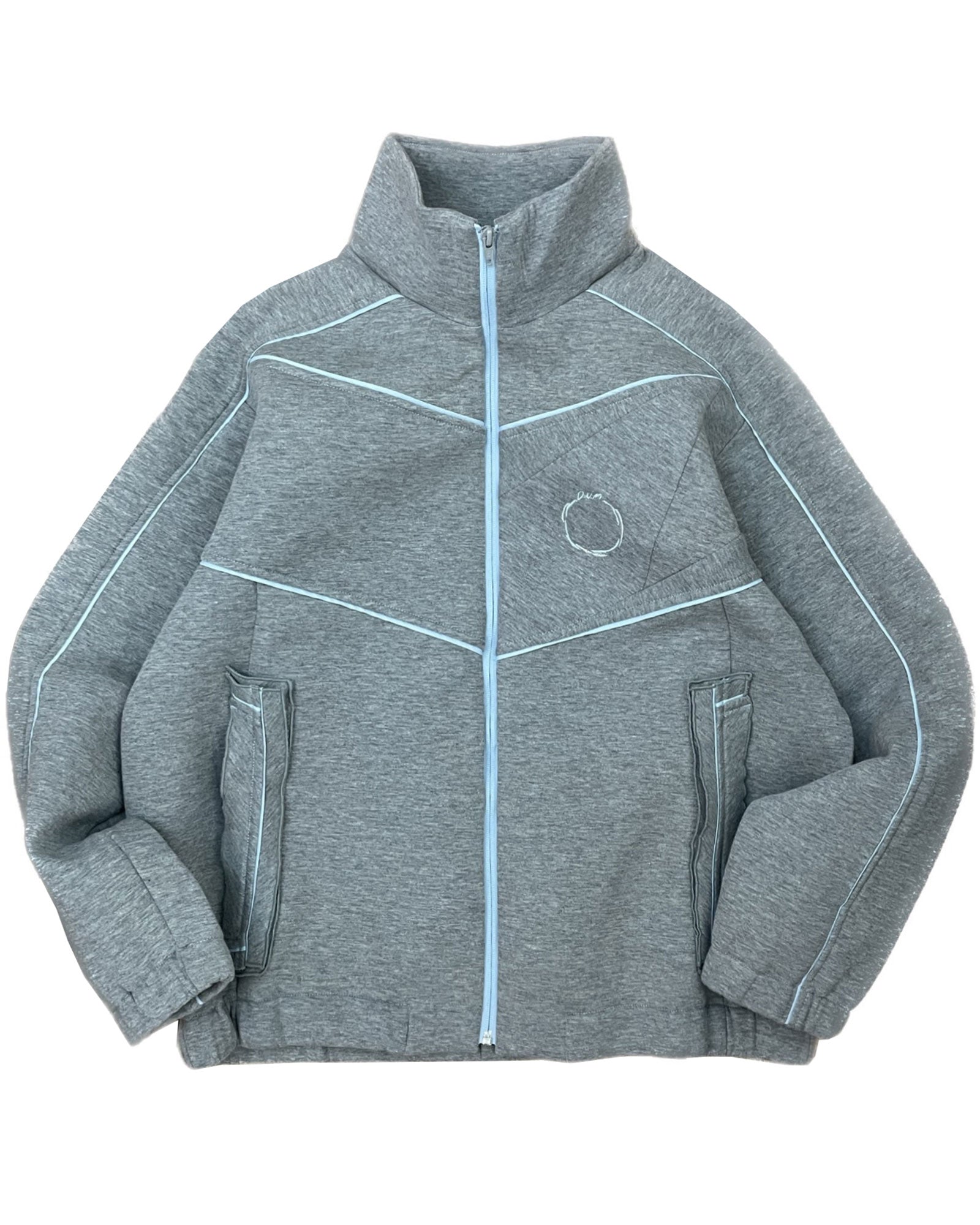 Ωらしさのあるグレーの色、ふっくらしたネオプレーン生地によるブランドを代表するトラックジャージのシルエット。ポケット箇所にデザイン的なディテールが施され、ラインパイピングのデザイン、重ね生地のパーツなどによってブランドらしさが込められている。